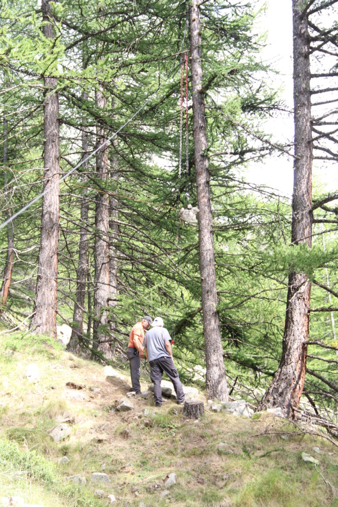 Installation de la cordelette de rappel pour éloigner le contrepoids du tronc du mélèze Contrepoids éloigné du tronc du mélèze par la cordelette de rappel (jaune) Vue d'ensemble. En agrandissant l'image on voit bien la cordelette de rappel (jaune), qui écarte le contrepoids du tronc du mélèze