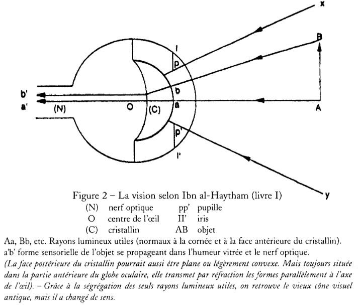 Huit siècles environ après Ptolémée, le savant arabe Ibn al-Haytham4 connu sous le nom d’Alhazen dans l’Occident médiéval – s’intéresse de façon très novatrice aux questions d’optique et de vision. Il est en effet le premier à les aborder en procédant à des expériences. Nombreuses et reproductibles, celles-ci vont l’amener à apporter la démonstration que « la vision se produit grâce à des rayons lumineux qui pénètrent dans l’œil et non grâce à des rayons visuels qui en sortent, comme le postulait l’optique géométrique de l’Antiquité »5.
