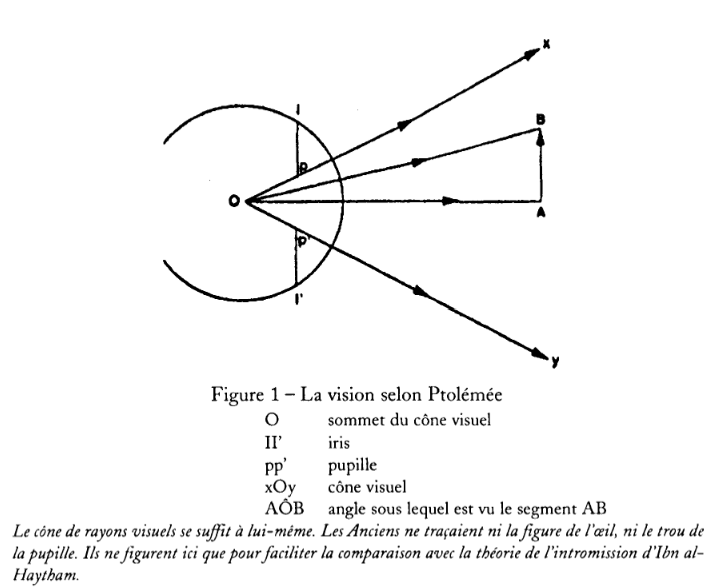Ptolémée reprend et développe l’analyse mathématique d’Euclide. Parmi les différentes théories de la vision développées par ses prédécesseurs – théories qui en l’absence de preuves sont nécessairement fondées sur des spéculations –, il opte comme Euclide en faveur de celle reposant sur la notion de rayon visuel « émané de notre œil et allant frapper l’objet »3.