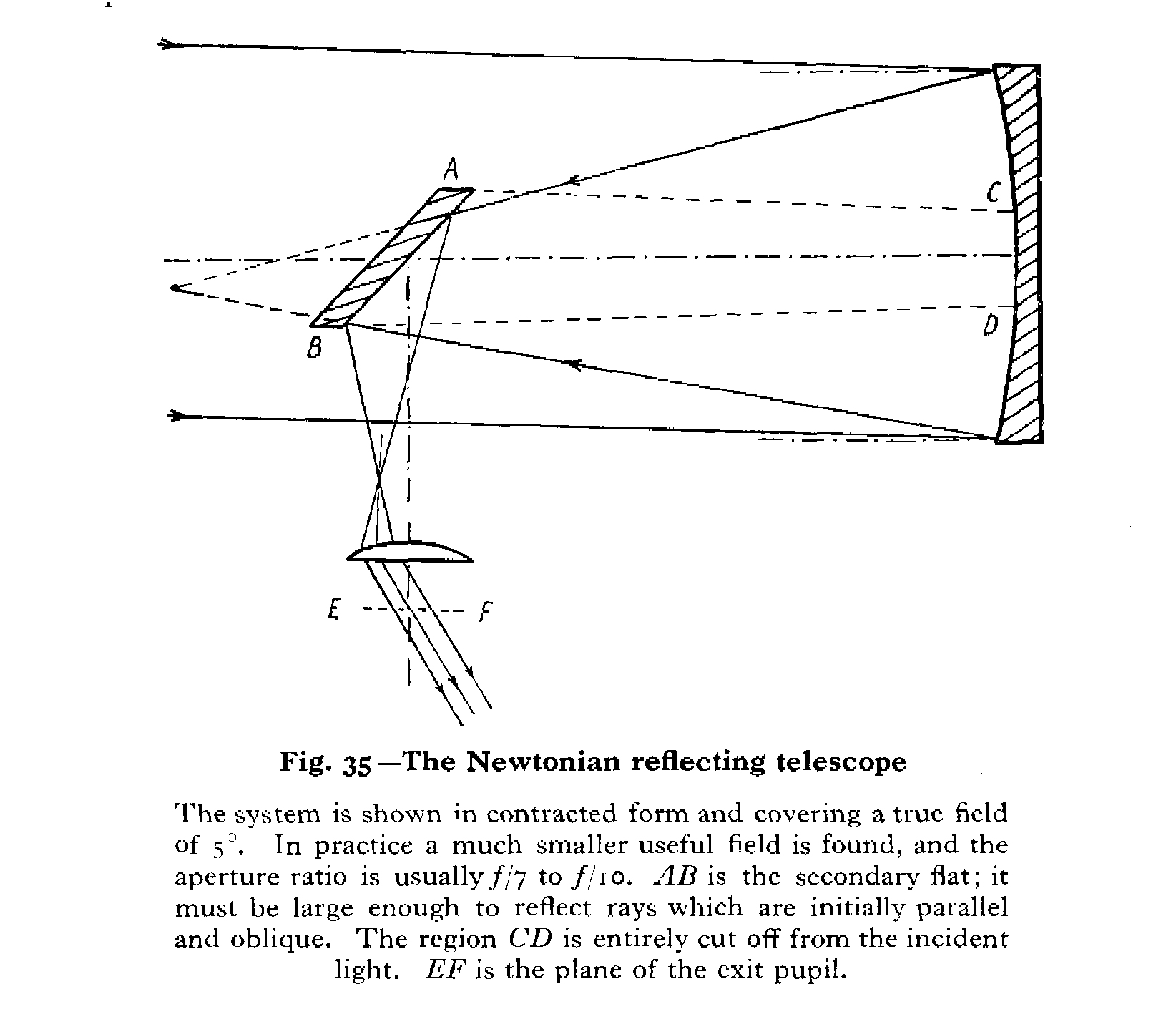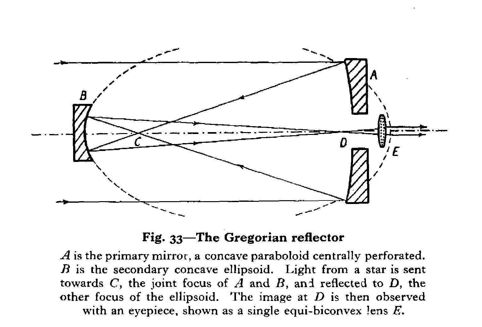 Gregory et Cassegrain ont tous deux imaginé l’astronome observant à l’arrière de l’instrument – comme dans le cas de la lunette de Kepler. Pour ce faire le miroir principal de leur télescope doit être percé en son centre d’un petit trou afin qu’y soit placé l’oculaire. Gregory renvoie sur cet oculaire la lumière réfléchie par le miroir principal à l’aide d’un petit miroir concave. Cassegrain de son côté a fait le choix d’un miroir secondaire convexe qui a l’avantage de corriger certaines aberrations du miroir primaire. Quant à Newton, c’est à l’aide d’un petit miroir plan placé à 45° sur l’axe optique du grand miroir qu’il renvoie sur l’oculaire la lumière de l’astre réfléchie par le grand miroir. Dans le cas de la combinaison newtonienne, l’astronome n’observe pas derrière le tube du télescope, mais sur le côté, à l’avant du tube du télescope.
